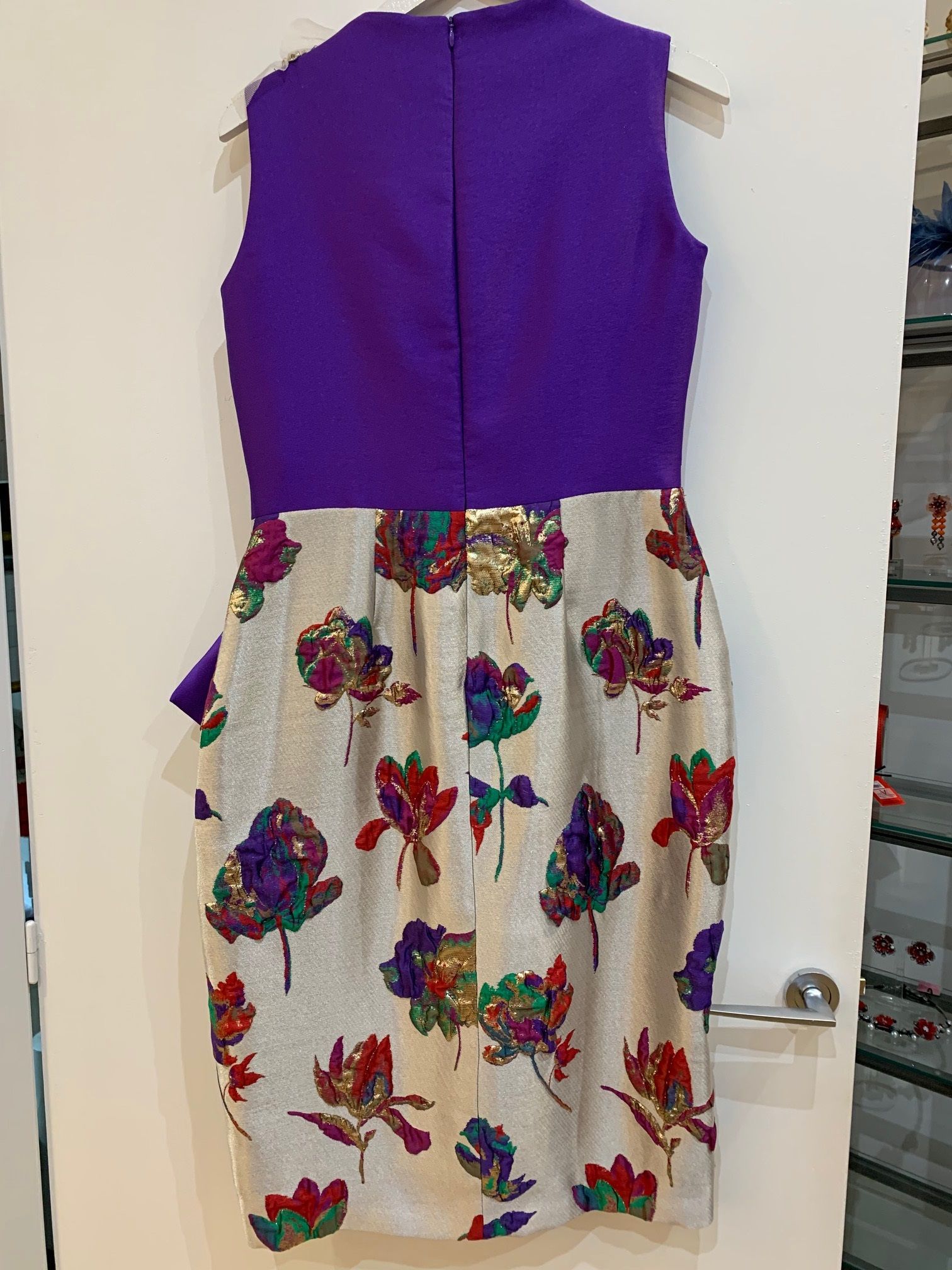 Vestido combinado, la parte de arriba es en mikado color morado, sin mangas y escote en "V", termina en la cintura con una pieza estilo fajín cruzado. Lleva detalle bordado en pedrería color oro viejo en el hombro.