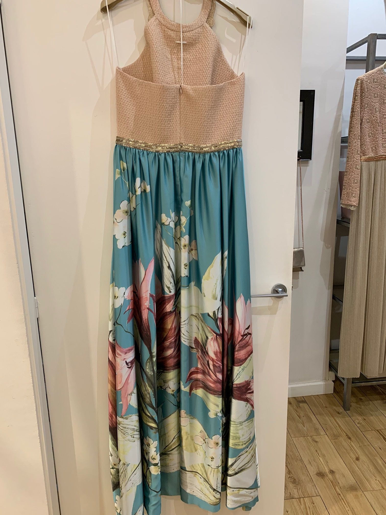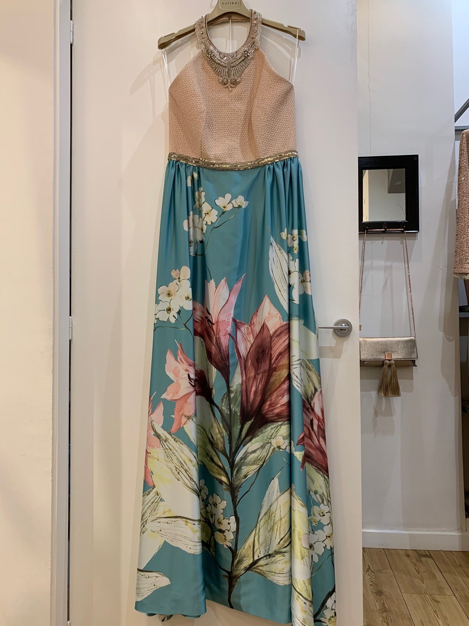 La falda del vestido es azul cielo satinada, combinada con un estampado floral en tonos verdes, rosas y crudos.