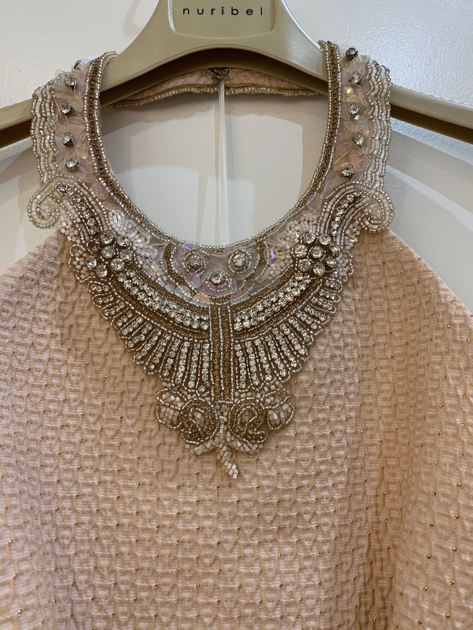 El cuerpo del vestido es entallado en color rosa claro. Con escote halter y detalle de collar adornado con cristales.