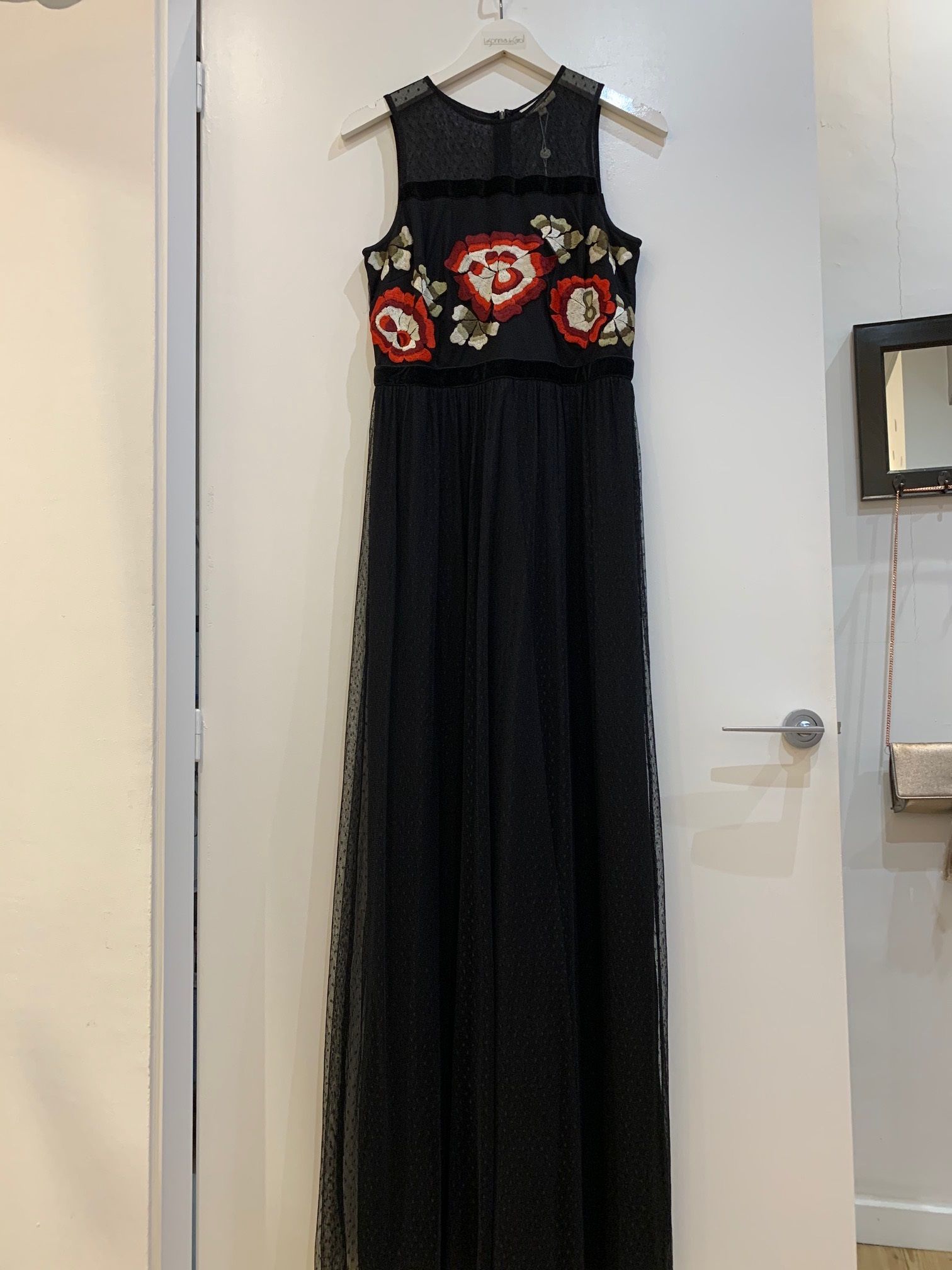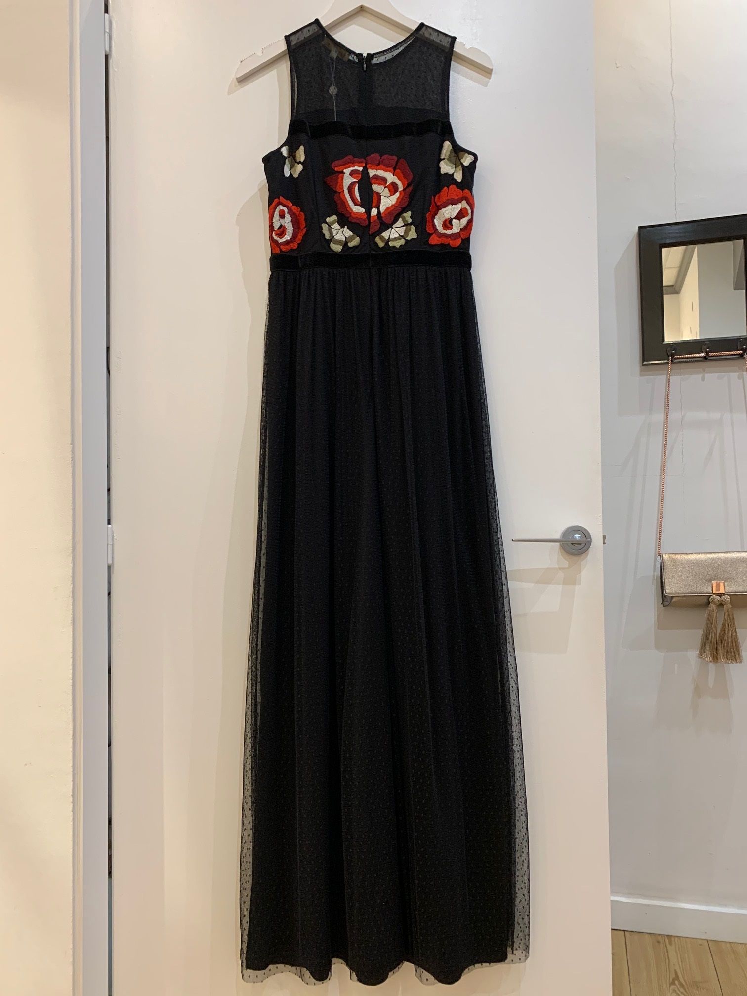 Vestido largo de tul negro con plumetti. Entallado hasta la cintura con detalle cinta terciopelo. Lleva flores bordadas en el pecho en tonos rojos y granates. Sin mangas. Cierre trasero con cremallera.