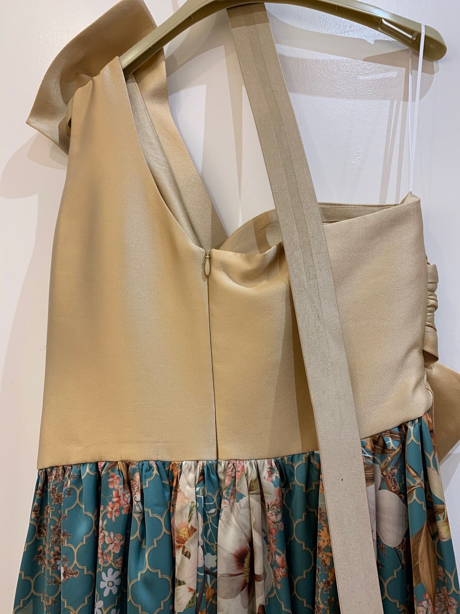 El cuerpo del vestido es en color dorado con detalle de pieza fruncida en el pecho. Queda entallado a cintura con un cinturón forrado de la misma tela que el cuerpo.