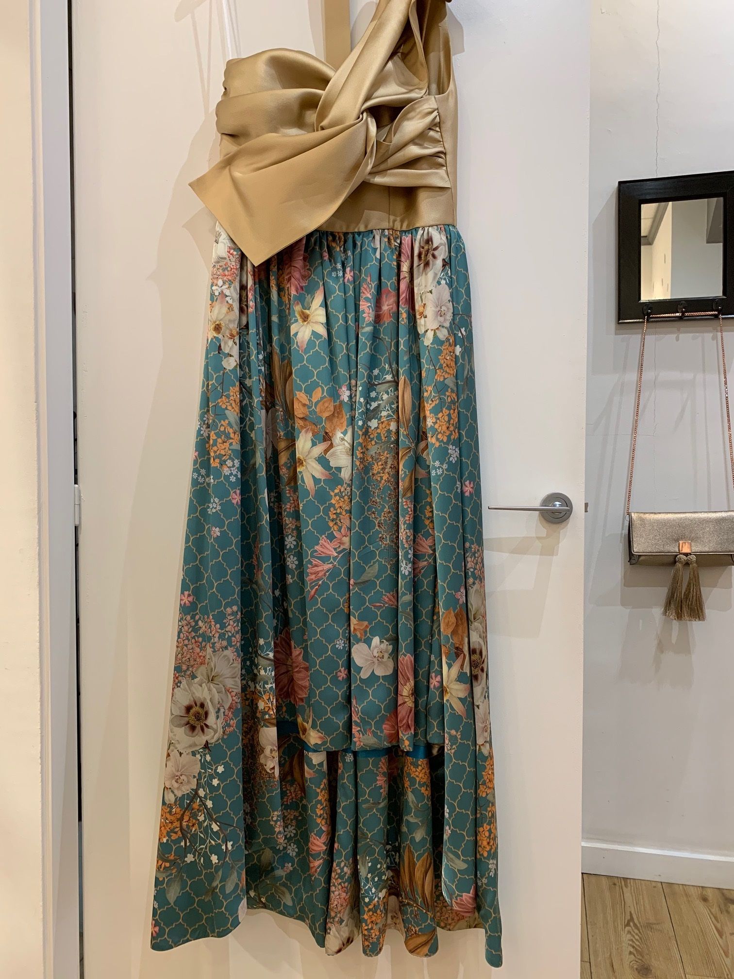 La falda del vestido es asimétrica: más corta de detante que de detrás. Estampada con motivos florales en tonos apagados y dorados.